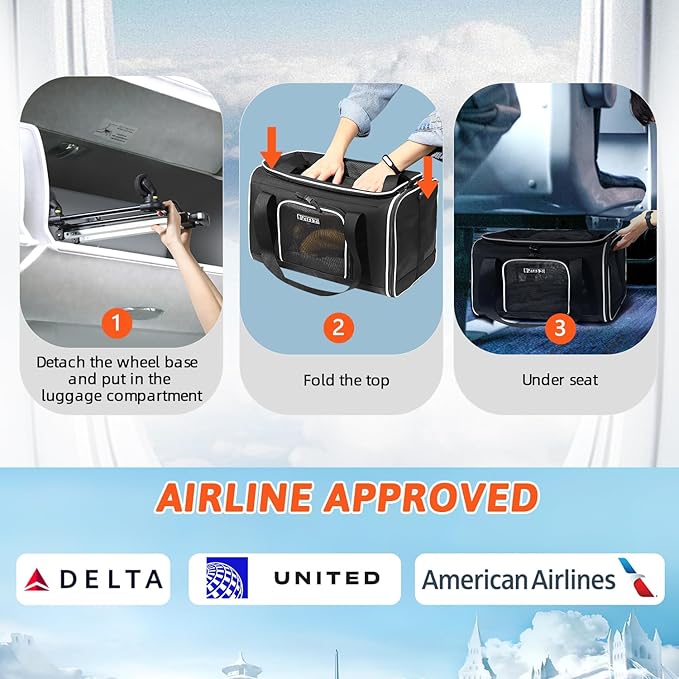 - 【AIRLINE APPROVED CARRIER 】Unfolded size:18"L×11"W×(11+3.5)"H, Petskd pet carrier is TSA approved and can be placed under the seat in the cabin(after remove the wheel base), it is mainly designed for ①Delta Airlines ②United Airlines③American Airlines. We recommend you buy this carrier when you fly with the above-mentioned airlines.