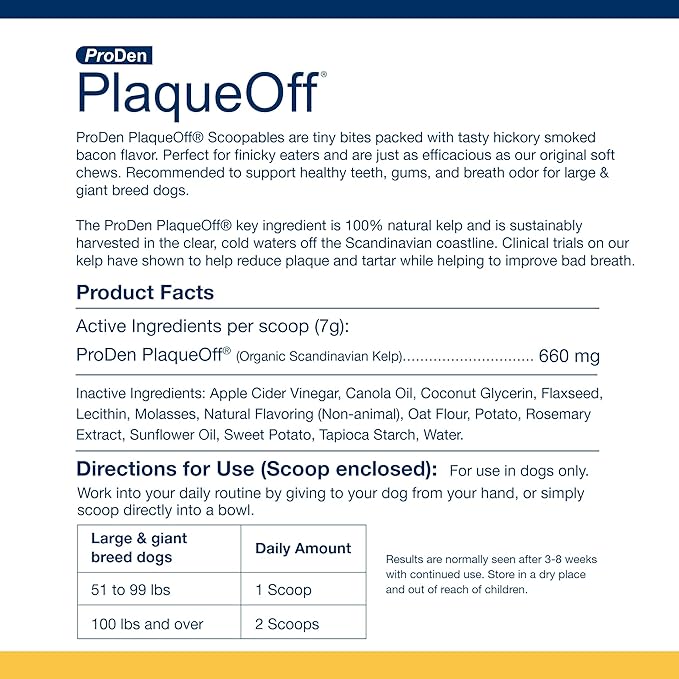 - Supports Dental Health - ProDen PlaqueOff Scoopables are specially formulated to support healthy teeth and gums in Large & Giant Breed Dogs, helping to reduce plaque and tartar build-up.