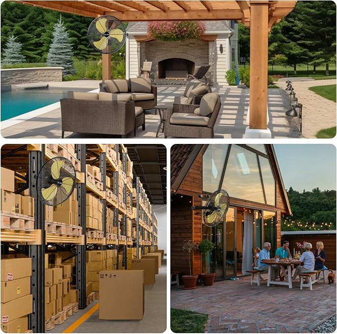 - Waterproof Outdoor Fan: Designed with sealed and lubricated industrial motor, IP44 waterproof, GFCI plug, and thermal overload protection for high humidity, dust, debris even raining conditions. Great for industrial, commercial, warehouse, and outdoor patios. This is an industrial wall mounted fan, the noise is slightly louder than home fans, but less noisy than most of the same size industrial fans