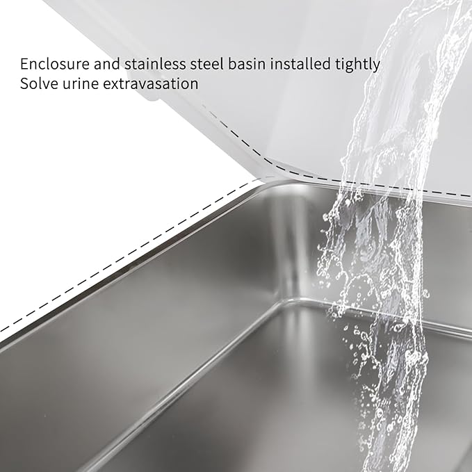 - 【Stainless Steel Basin】 The basin is made of stainless steel which is rust-free, odorless, sturdy and durable for long-term use. Compared with the plastic litter box, the stainless steel material is less likely to make the litter stick to the bottom, and the litter will slide off the smooth surface, which also brings great convenience for cleaning the litter box.