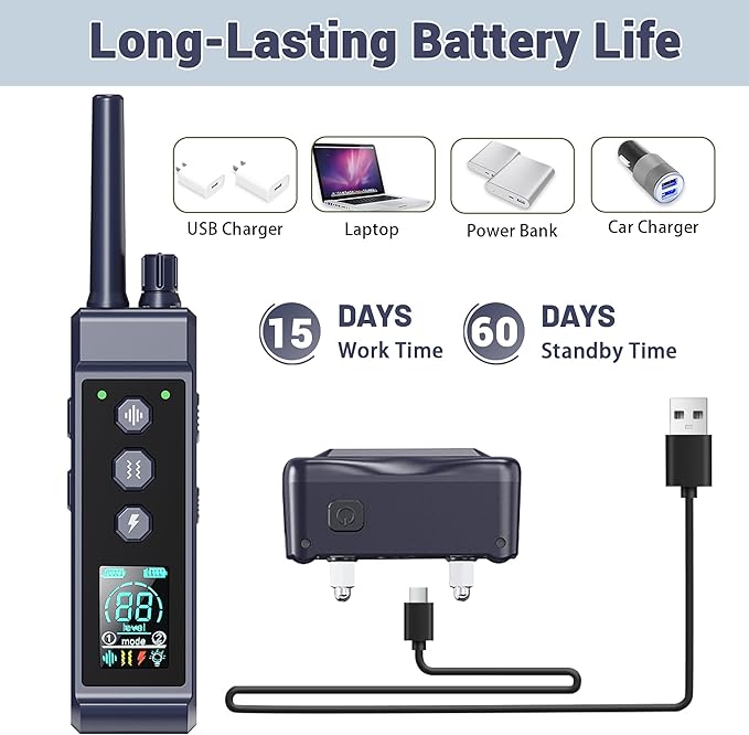 - Rechargeable Dog Barking Control Device with Long Life Battery: The latest lithium battery technology for dog barking control collars provides longer battery life. The electric dog collar only takes 2-3 hours to charge each time and can be used continuously for 15-60 days. There are two light modes on the receiver collar, pure white light and flash light, which are convenient for outdoor activities at night to find your dog