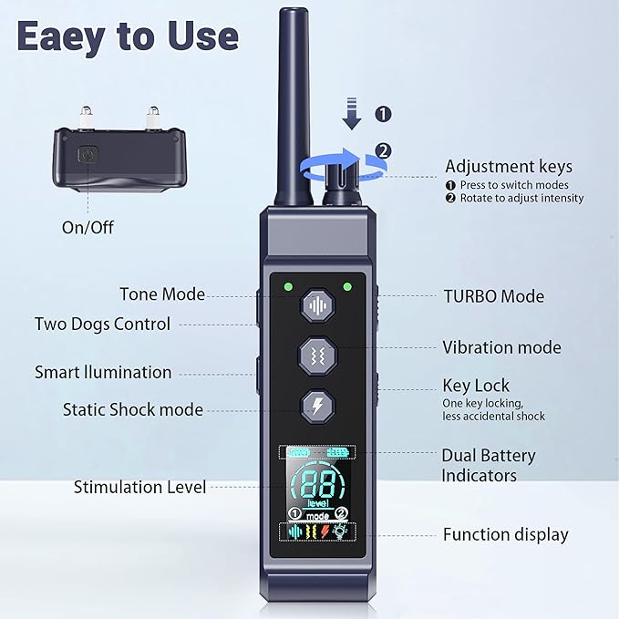 - Simple and practical keyboard lock: The independently set keyboard lock can prevent accidental pressing of buttons when carrying the remote control, avoiding frequent and incorrect use of the dog training device that may cause adverse reactions and disgust to your pet friends