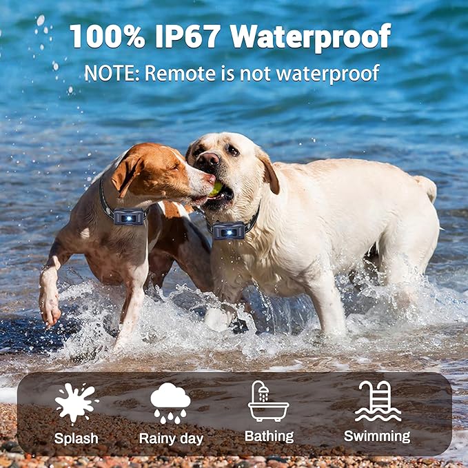 - IP67 Waterproof and Dustproof Receiver: The dog shock collar with remote control receiver has IP67 waterproof function, which provides you with maximum flexibility during outdoor activities. Dogs can wear the shock collar to play and run freely in the rain, which can meet multiple usage scenarios such as showering, swimming and stream hiking