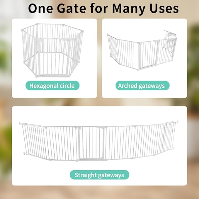 - 【MULTI-PURPOSE SAFETY FENCE BABY GATE】Great for wide spaces, angled openings, hallway, doorway, or bottom of stairs; It can be used as a freestanding pet gate when you set it up as a circular enclosure; It can be installed as a freestanding Playpen for your kids. Also suitable to use around fireplaces, grills, wood-burning stoves, Christmas trees, etc.