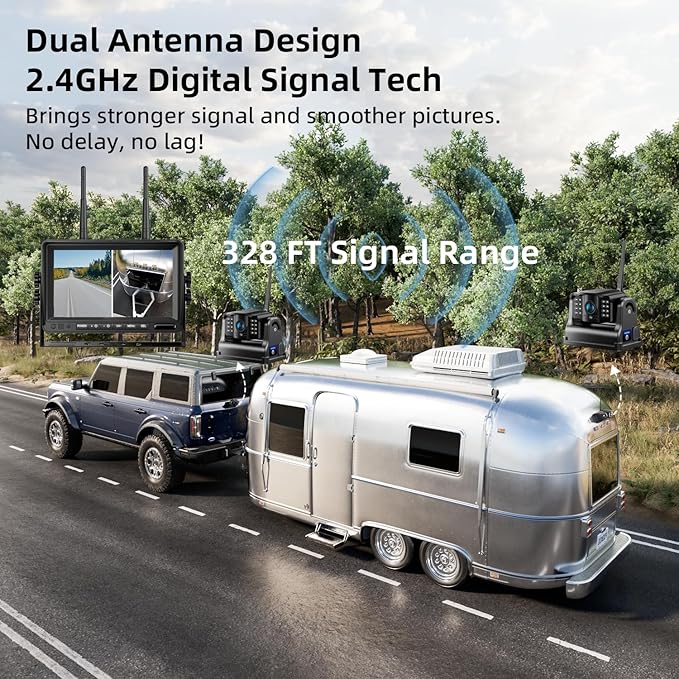 - Dual-antenna & 2.4GHZ Wireless Signal : Utilizing advanced 2.4GHz wireless signal technology and dual antenna design, it provides a more reliable and stable signal with no delay and no lag in images. With a reception range of up to 200ft in the open, it shows you your surroundings in real time, even at high speeds of 102 mph.Suits for car/SUV/camper/truck/voyager RV/jeep truck/pickup/horse trailer/fifth wheel/van/tractor/boat ect.