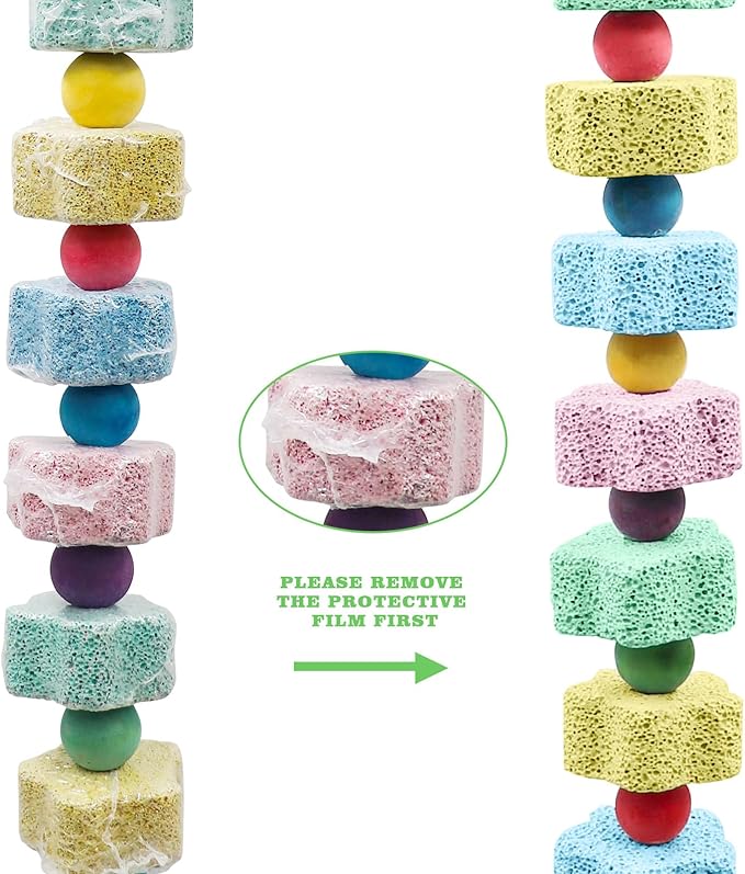 - Extra Long Parrot Chewing Toy: Compared to regular parrot chewing toy, our parrot chew toy is longer in size and hold more teething stones for longer use by more birds. The combination of calcium stones with different colors can not only attract birds to bite and play, but also decorate your birdcage.
