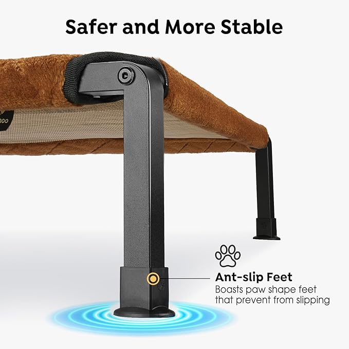 - Enhanced Durability: One Piece Tubing Sturdy Design resists bending, and the heavy-duty frame is thicker than other normal beds, ensuring lasting durability. With anti-slidding silicon feet, this elevated dog cot offers superior stability, making it a safe and reliable choice for even the most active pets.