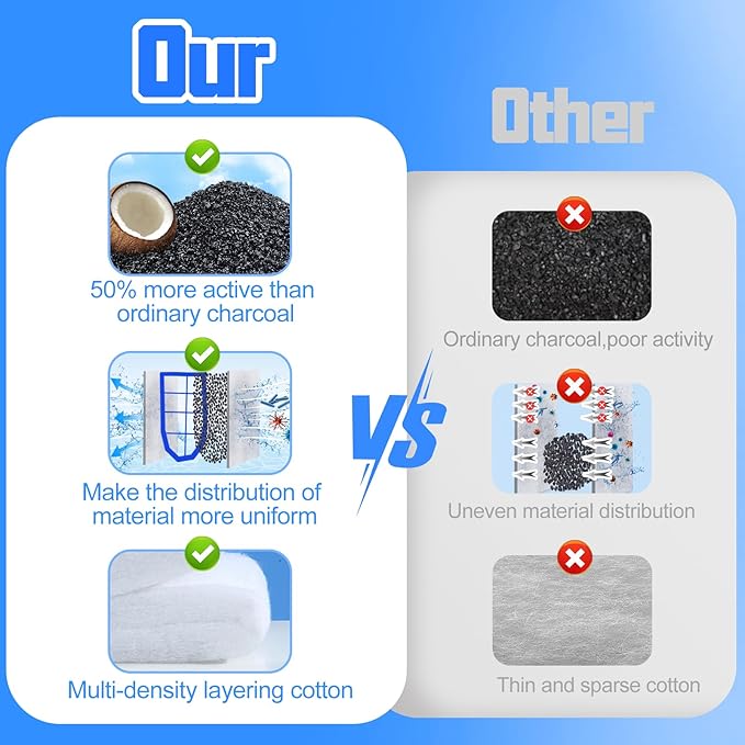 - CARBON+ZEOLITE- Upgraded the filling material by adding zeolite in addition to nutshell carbon. Zeolite has a great effect in adsorbing ammonia, nitrogen, heavy metals and other harmful components in the water and maintaining the balance of PH value in water. Our filter cartridges are made of high-density cotton+ strong activated nutshell carbon+ premium zeolite, making your fish live in healthier and clearer water quality.