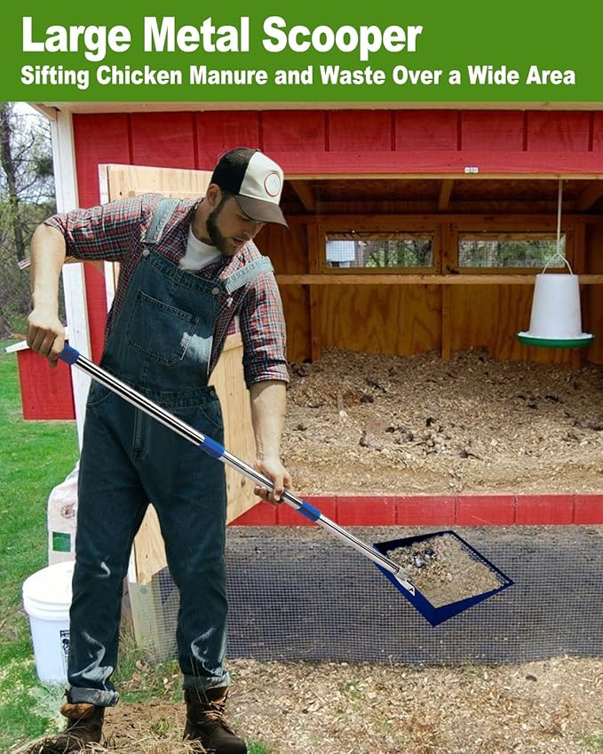 - 【Extended Handle for Ease of Use】 Equipped with a 44.5in long handle made of sturdy stainless steel, this litter scooper allows you to clean the chicken coop without the need to bend over excessively. This design reduces strain on your back, ensuring comfort during use and making it one of the most practical chicken coop cleaning tools.