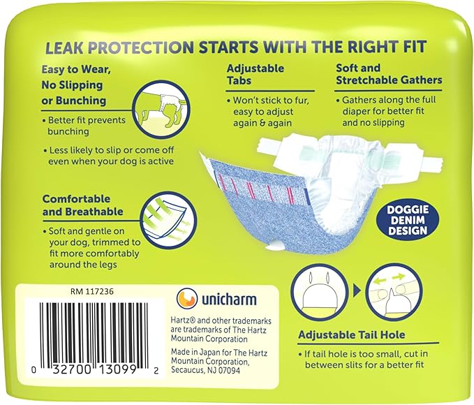 - MAXIMUM COMFORT: Hartz Comfitables Dog Diapers are designed with maximum comfort and a secure fit. Made with soft and breathable materials, a stretchy elastic waist, and a patented shape, these diapers are easy to wear and feature a new fashionable unisex doggie denim design. Contains 12 diapers.