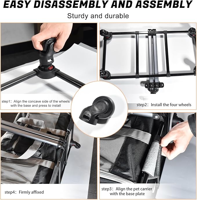 - NEWLY UPGRADED PLATFORM AND PULLEYS: The crossbar of the pet carrier with wheels is designed to look like a suitcase, use it as a duffel bag or handbag. With 4 high quality removable wheels that rotate 360° and a push-button locking handle that can be adjusted to different stages to suit pet owners of all sizes, you can effortlessly move in any direction through the streets, shopping malls, supermarkets, vet hospitals and more.