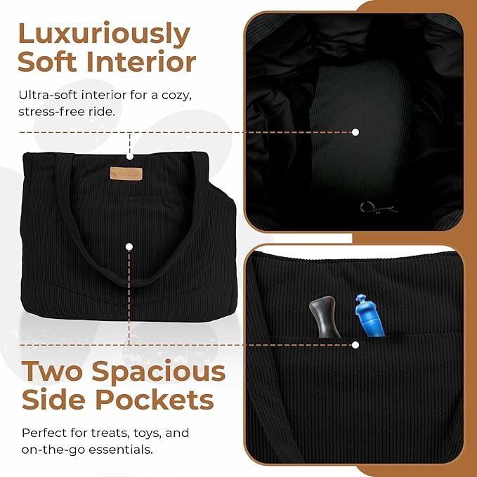 Corduroy Dog Carrier - Lightweight Cotton Soft-Sided Pet Tote with Safety Harness Clip - Breathable Travel Carrier for Small Dogs and Puppies (Black)