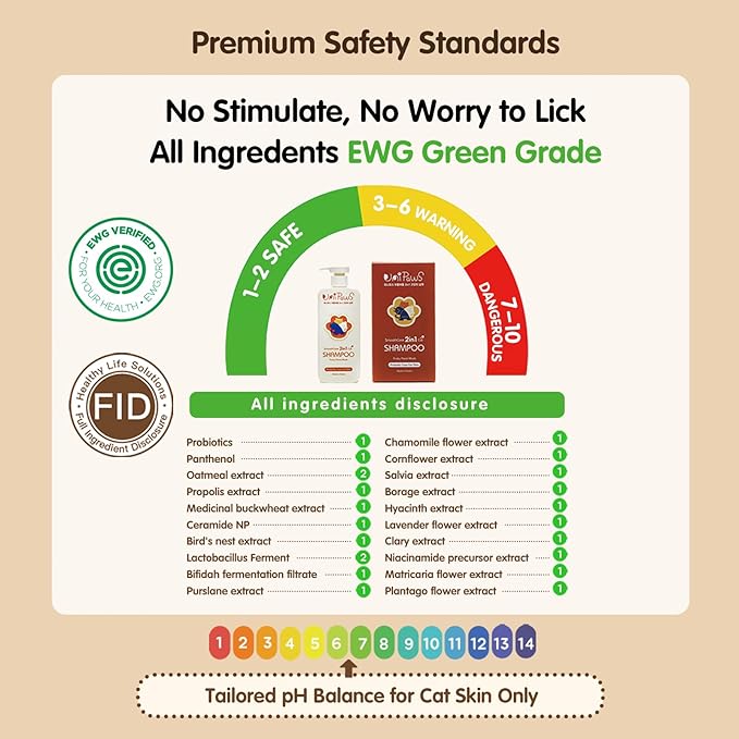 - Hypoallergenic & Tearless Formula for Sensitive Cats: Ideal for kittens, long-haired, short-haired cats, and even hairless Sphynx, this gentle, tearless shampoo and conditioner is perfect for sensitive skin. Made with natural ingredients like probiotics, oat, and propolis, it nourishes while leaving a fresh, shiny coat. Lick-safe and certified by the Korean Department of Animal Medicine, it provides peace of mind for responsible pet owners. Plus, it’s EWG Green Grade certified and comes with full ingredient disclosure (FID) for complete transparency.