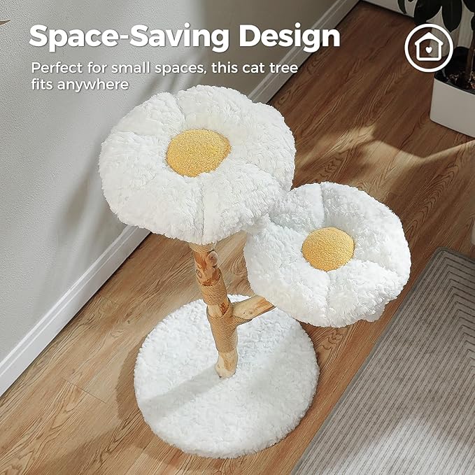 Wood Flower Cat Tree, Modern Cat Tower with Real Wood Branches, Luxury Boho Furniture with Scratching Post and 2 Perches, Cat Climbing Tower for Indoor Cats, Cloud White