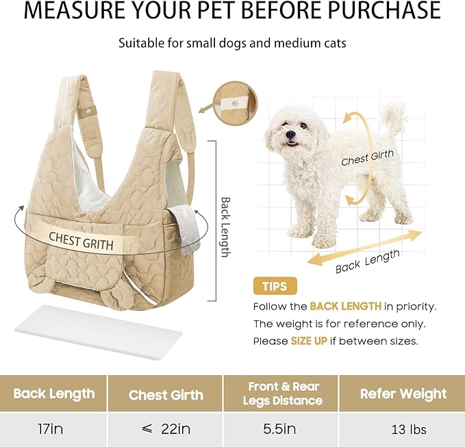 - 【Pet Carrier Backpack Dimensions】: Measuring 17.5" x 17.5" x 6.5", this Pet Carrier Backpack is ideal for pets weighing up to 13 pounds. Adjustable shoulder straps (29–35 inches) ensure a secure and comfortable fit for most users. Be sure to measure your pet and refer to the size chart (Fig. 2) to select the appropriate size.