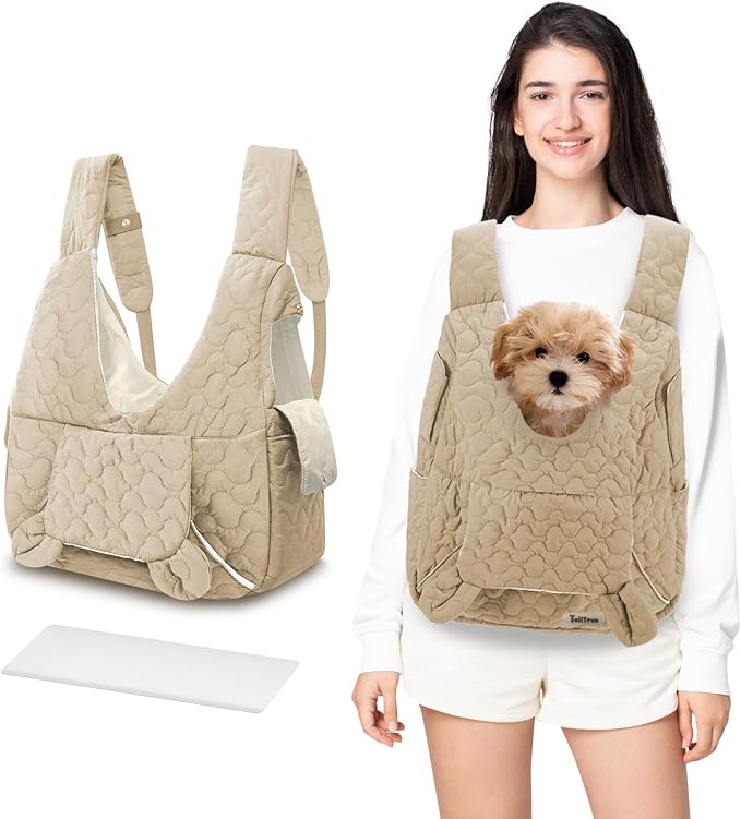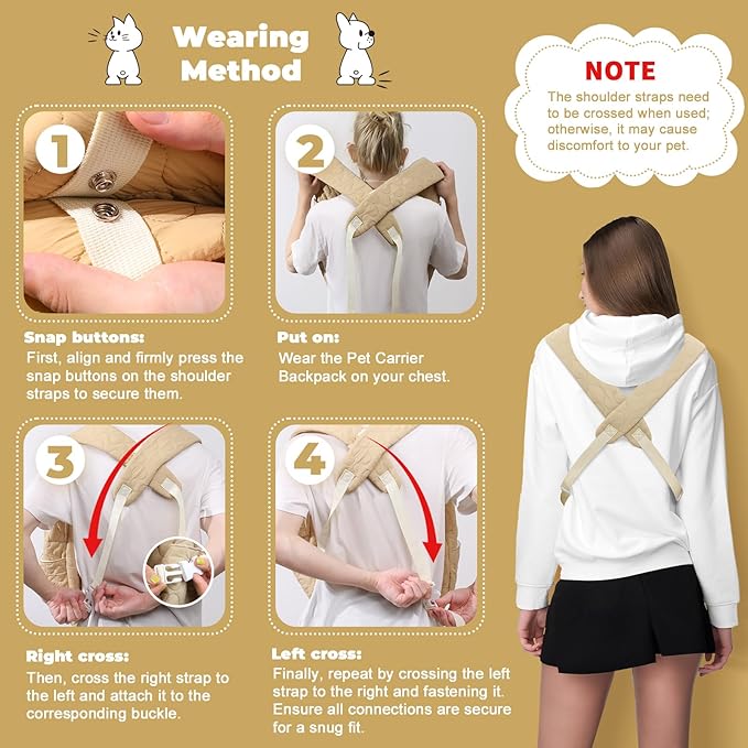 - 【Multiple Pocket Design】: Our Pet Carrier Backpack is equipped with multiple pockets, including two side pouches and front and rear zippered pockets, offering ample storage for essentials like snacks, waste bags, your wallet, phone, or keys. Everything you need is within easy reach. (𝐏𝐥𝐞𝐚𝐬𝐞 𝐧𝐨𝐭𝐞: If you find the straps too long, cross them when using to prevent slipping off your shoulders. For step-by-step instructions, please refer to Figure 4.)