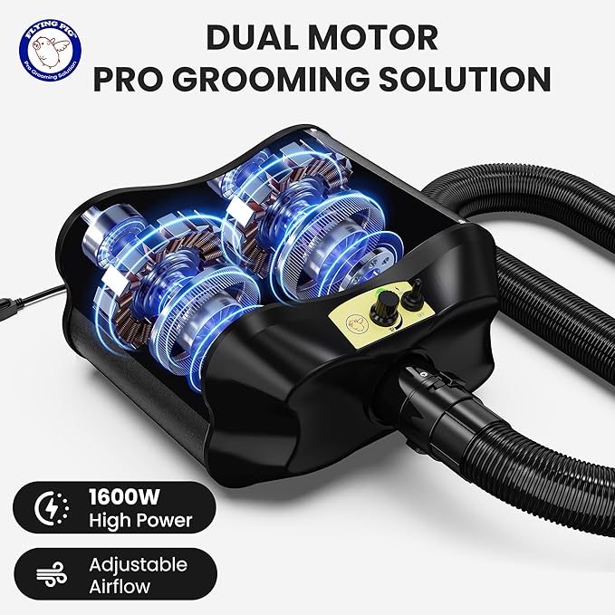 - Dual Motor & Adjustable Airflow -Provides powerful and stable airflow to help you with those furriest and thick coated friends. The dual motor provides stronger airflow than many dryers. Watts: 1600/Volts: 120V