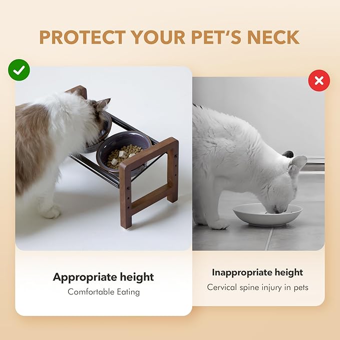 - 3 Adjustable Heights & 2 Placement Options: This stand offers 3 adjustable heights, ranging from 5.5 inches to 8.7 inches, catering to the needs of pets at different growth stages. The circular metal component on top of the stand features two distinct placement options, allowing the bowls to be either horizontally aligned or tilted. Our products are designed to help protect the pet's cervical spine and meet their diverse needs.