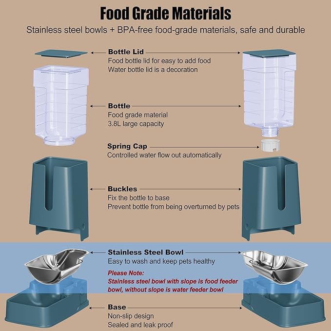 Automatic Cat Feeder and Cat Water Dispenser Set with Stainless Steel Bowls Gravity Dog Feeder for Small Medium Big Dog Pets Puppy Kitten, 3.8L x 2 (Cyan)