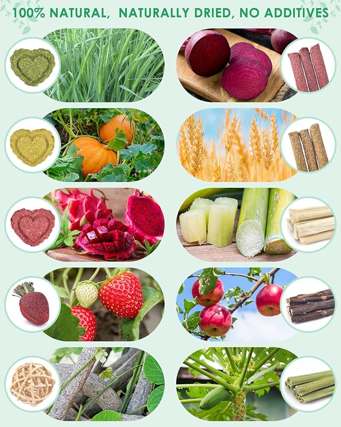 - MADE OF NATURAL MATERIALS: 53 sets of hamster chew toys are made of natural apple wood, carrots, wheat, Timothy grass beets, dragon fruit, strawberries, rattan, sweet bamboo, pumpkin, papaya stems, each of which is double baked to improve durability and safety, ensuring non-toxic, pigment free, hormone free products and a safe chewing experience