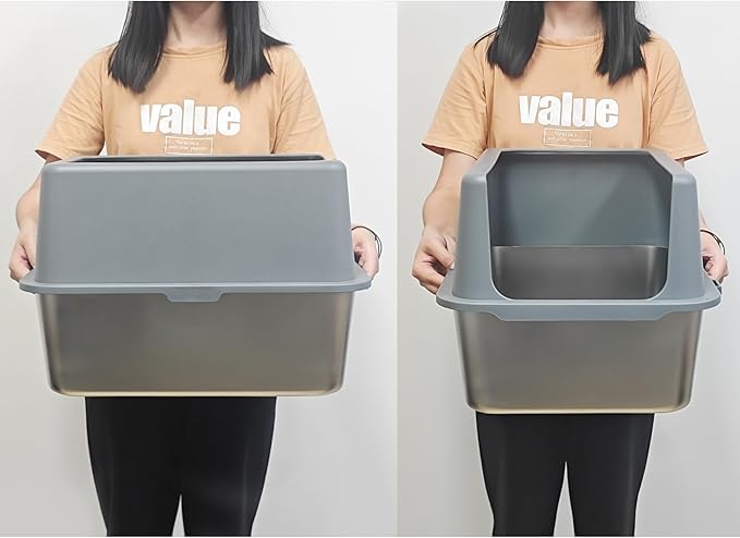 - Sturdy Stainless Steel Material:Stainless steel cat litter box with lid is made of high quality stainless steel metal, which is durable and has a long service life. Don't need to replace the steel cat litter box frequently. The stainless steel litter pan also features odorless, non-stick bottom, non-slip, no residual stains and smooth surface.