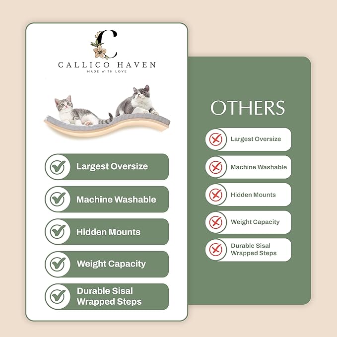 - VERSATILE & INTERACTIVE - Designed to engage your cat’s natural climbing instincts, this versatile wall cat climber can be used on its own or combined with other Callico Haven shelves and steps to create a dynamic cat climbing wall. Whether used as a wall-mounted cat bed or as part of a larger cat shelf for wall climbing, its large size and sturdy design make it perfect for active and playful cats. This floating cat shelf offers a high vantage point for relaxation and observation.