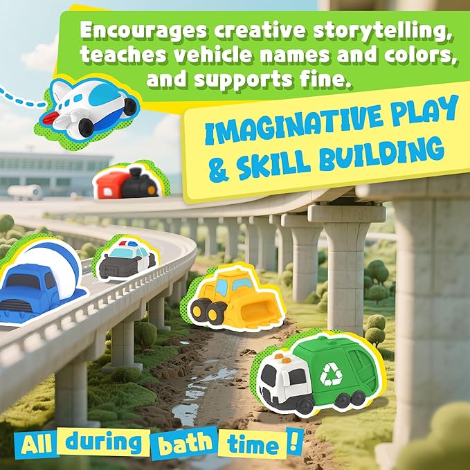 - 4.Inspire Imaginative Play: Encourage creativity and learning through play! Identify different vehicles, create fun bath games, and develop fine motor skills with vibrant colors and engaging designs.