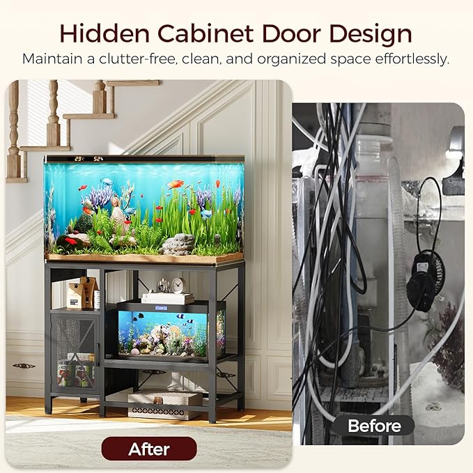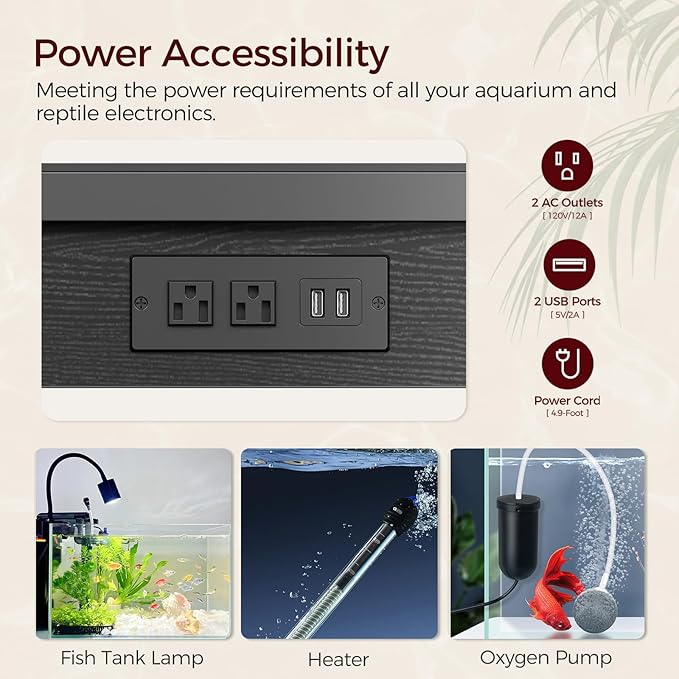 - Easy Power Solution: The fish tank stand, designed for 40-50 gallon tanks, includes 2 AC outlets and 2 USB ports, making it perfect for powering aquarium electronics such as lights and filters. Simplify aquarium maintenance with a handy socket