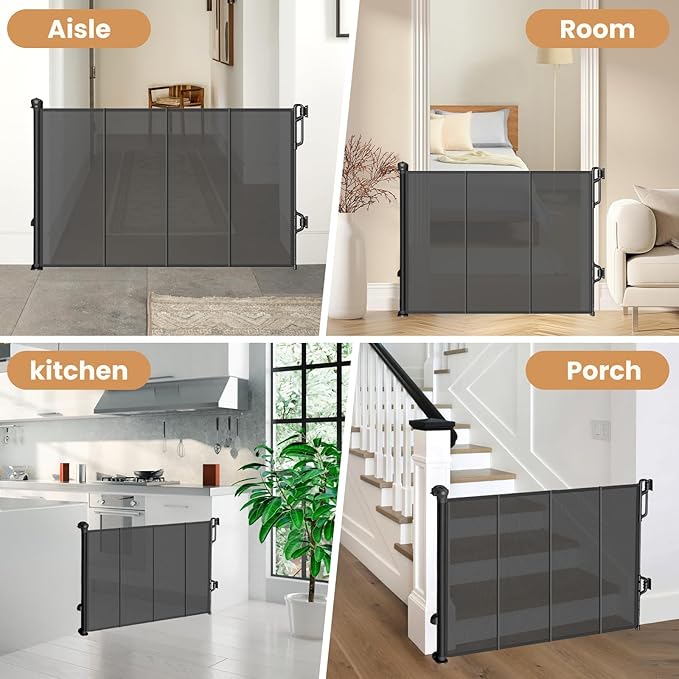 - 【Fits Your Purpose Perfectly】- The retractable baby gate is a perfect solution for providing safety and secruity space for children and pets. It is used for children and pets blocking off their way out or in. It's suitable for the kitchen, bedroom, living room, stairs, and other off-limit areas inside your home, providing a safe area for your little one. For use in both indoor and outdoor spaces.