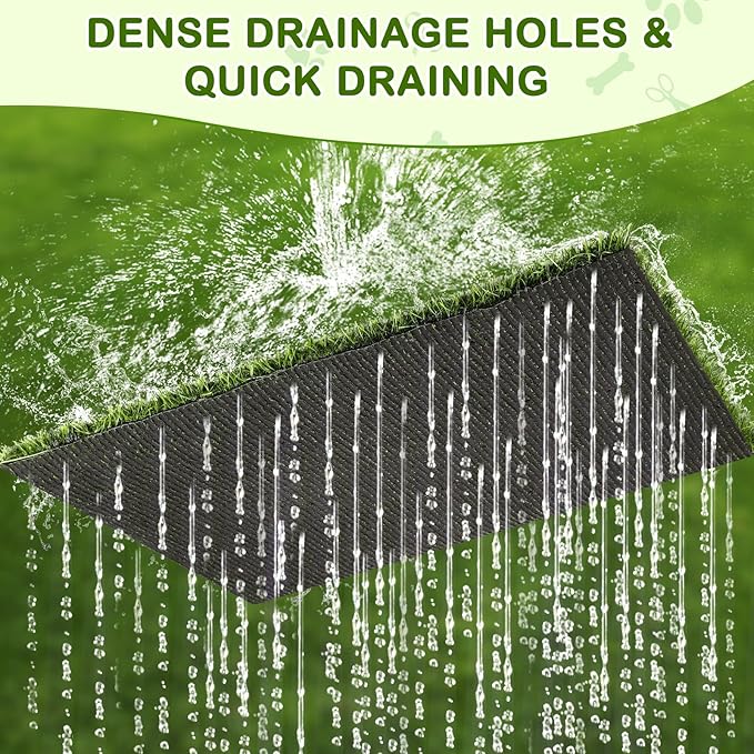 - Quick Drainage & Odorless: Our fake grass pee pads for dogs has dense drainage holes in the back with high water permeability, pearl cotton mat porous design helps urine and moisture drain out quickly, urine immediately seeps through the grass pad for dogs and pearl cotton mat to the bottom of the tray, won't stain your pet's paws, reduces odors and keeps the area fresh.