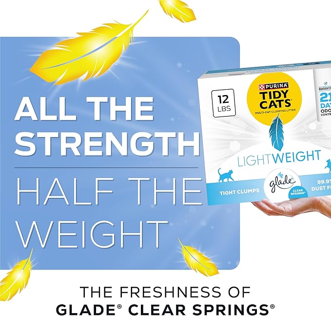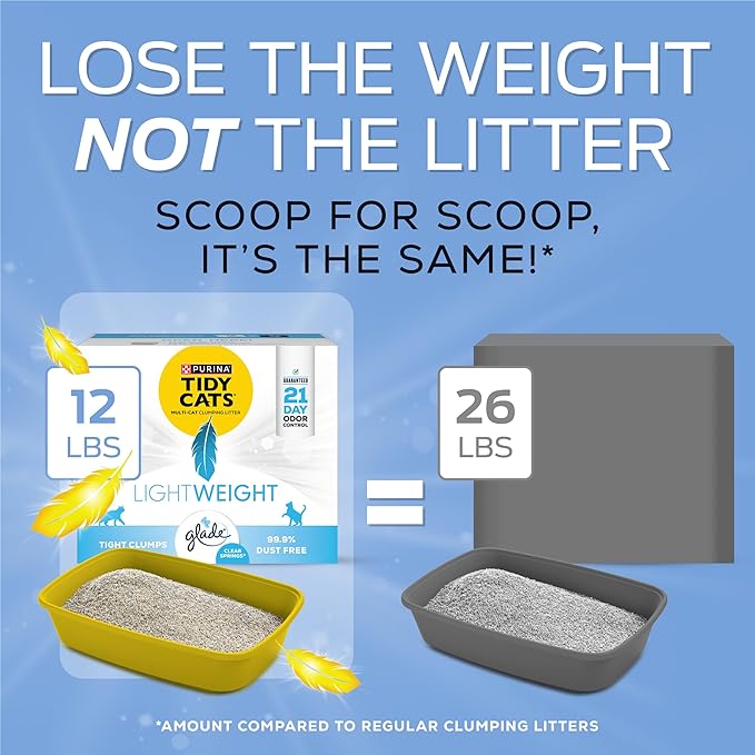 - LIGHTER CAT LITTER: Tidy Cats cat litter lightweight formula is 50 percent lighter than the leading clumping litter--less weight, not less litter.