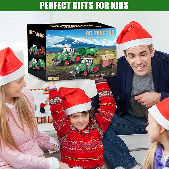 fisca Remote Control Tactor Toy Set & 33PSC Farm Vehicle Playset - Animal Figurines ,2.4GHz 1/24 Scale RC Tractor,Livestock Trailer, Fence with Light for Kids Age 4, 5, 6, 7 and Up Years Old