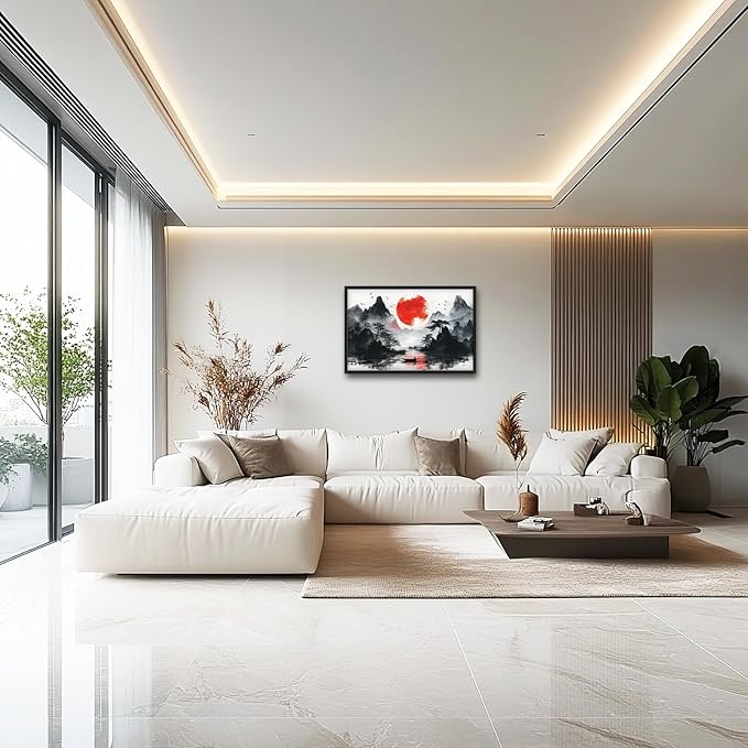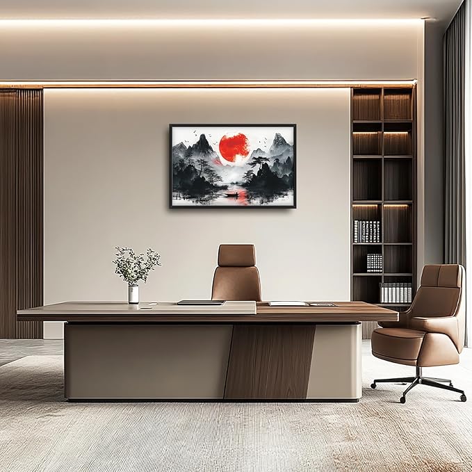Framed Large Japanese Mountain Wall Art for Living Room, Oversized Asian Red Sun Lake Landscape Wall Decor Nature Canvas Painting Home Decoration for Living Room Bedroom Office 36"x24"