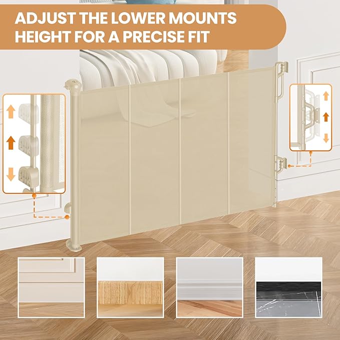- 【Adjustable Mounts & Easy Installation】 - The lower gate mount & catch mount that can fit any wall with / without baseboard, making it safer, more practical and easier to install. Each pack contains 1 retractable baby gate and the required installation accessories. Mesh dog gate can be widely used for indoor and outdoor areas such as doorways, stairs, hallways.