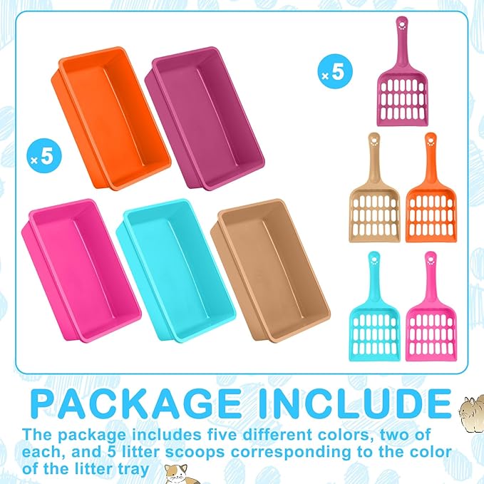 - Cat Pan Set: you will receive 5 pieces plastic cat litter box and 5 pieces plastic litter scoops, available in 5 different colors to meet the preferences of different cats; No need to buy separate scooper, which brings convenience to your life; Ideal for having multiple cats pet only homes and pet hospitals
