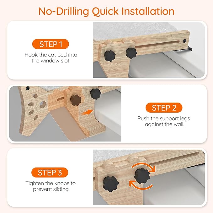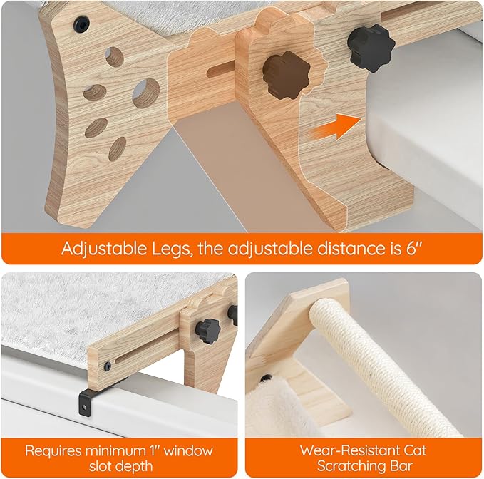 - Adjustable Design: The front legs of the windowsill cat bed can be movable. Turn the side knob to adjust the distance from the support legs to the windowsill. The 0''-6'' range fits varying windowsill widths, creating a stable resting corner for your cat