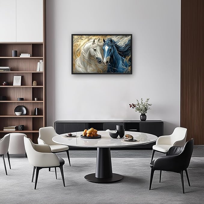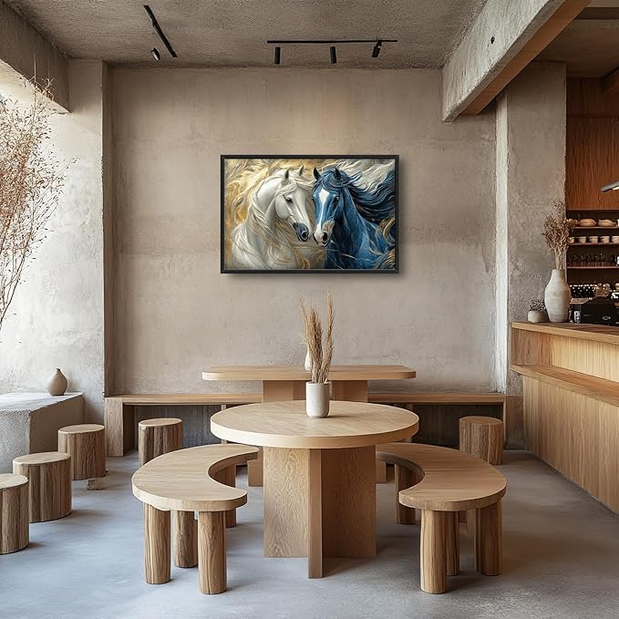 Framed Large Horse Wall Art for Living Room, Oversized Abstract Horses Wall Decor Blue and Golden Canvas Painting Animal Pictures Modern Artwork for Living Room Bedroom Office 36"x24"