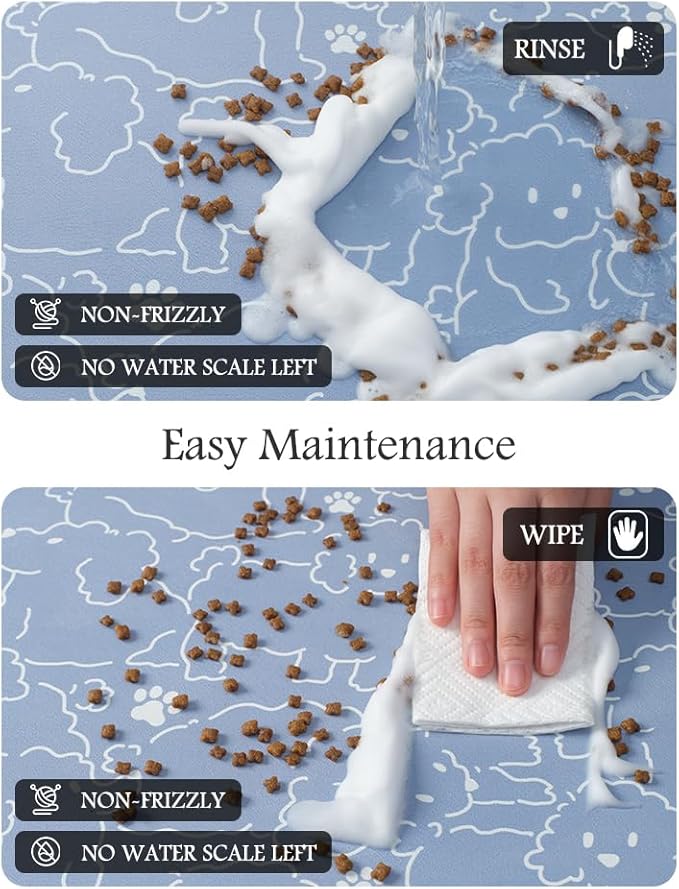 - Keep Clean & No Stains:No marks will be left when food and water are dropped on the dog food mat. Unlike traditional silicone pet feeding mats, our pet feeding mat for food and water won't pick up pet hair or dust, and won't build up tough-to-clean limescale, keeping the dog bowl mat as good as new forever.