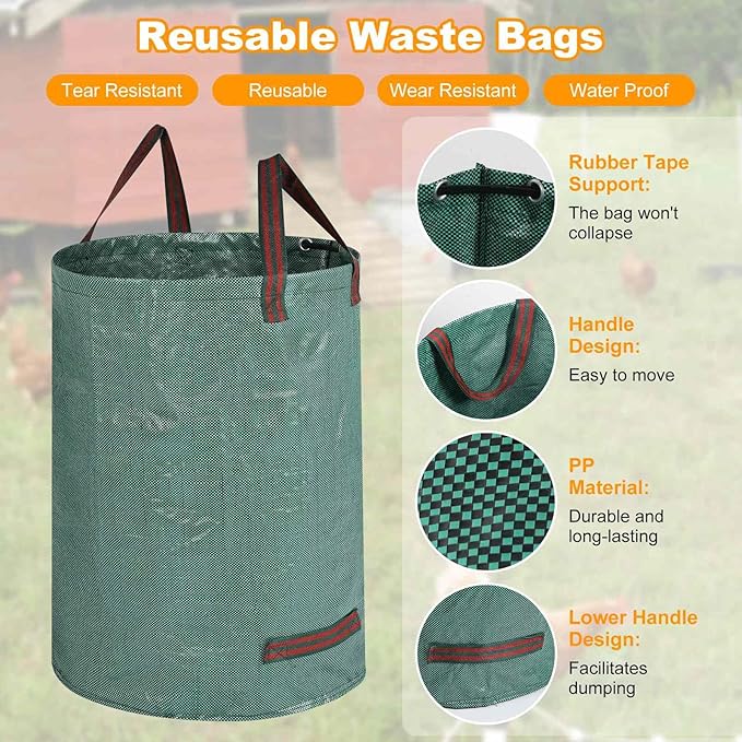 - 【Heavy Duty Waste Bags】: 26 Gallon Reusable Bags; Diameter 19", Height 25", Yard Waste Bags with Gloves. It's made from rugged rip-resistant polypropylene fabric; Well-made, Reusable, Standable waste bag. It's great for chicken coop, garden and farm