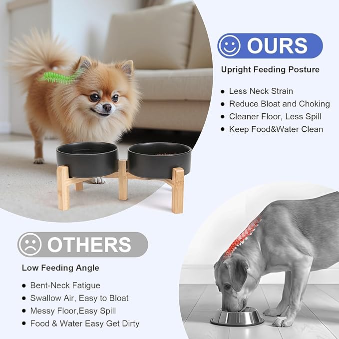 - Stable, Tip‑Resistant Design – A solid bamboo frame with Chew‑Resistant Heavyweight Ceramic, wide stance, and slip‑proof silicone pads join forces to create raised dog bowls that STAY IN PLACE on tile, wood, or laminate. Fewer spills mean cleaner floors and no accidental gouges or scratches or noisy