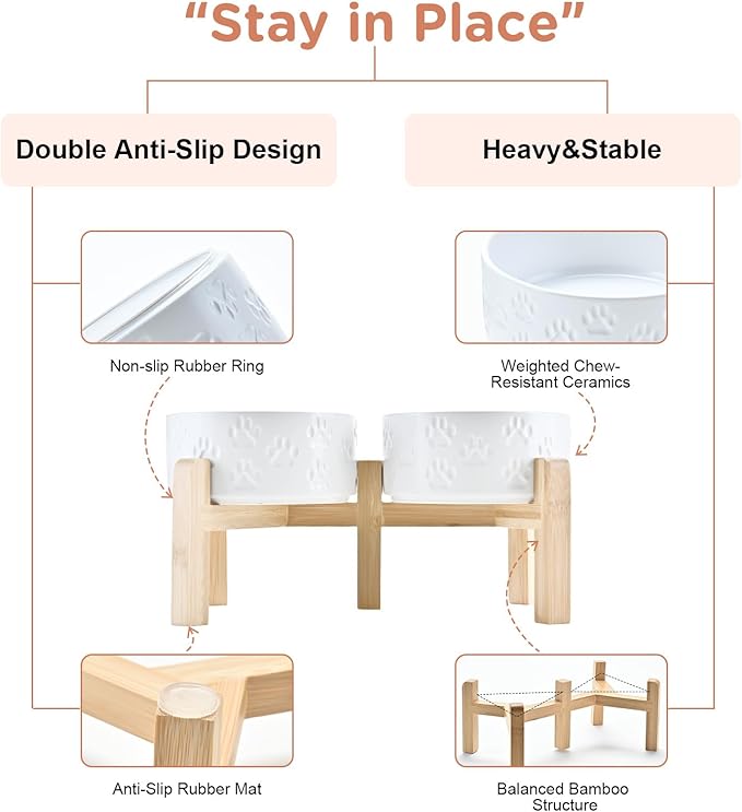 - Stable, Tip‑Resistant Design – A solid bamboo frame with Chew‑Resistant Heavyweight Ceramic, wide stance, and slip‑proof silicone pads join forces to create raised dog bowls that STAY IN PLACE on tile, wood, or laminate. Fewer spills mean cleaner floors and no accidental gouges or scratches or noisy