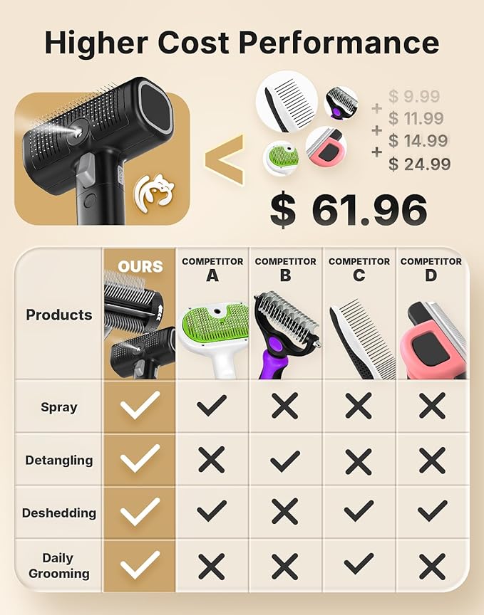 - [5-in-1 Multifunctional Cat Brush] WOWOOF PET cat brush integrates 5 different combs — one end is a floating hair comb with spray function, which can reduce static and floating hair. And it also has one-button hair removal function, easy self-cleaning. The other end is a 4-in-1 grooming rake. You can easily converse four different combs by rotation. Just one WOWWOF PET cat brush can meet all your pet's grooming needs. Higher cost performance