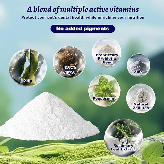 - No-Brush Innovation for Effortless Care: Designed in a convenient powder form, eliminating the need for toothpaste, toothbrushes, or floss. Simply sprinkle the appropriate amount of powder into your pet's food based on their weight for easy, stress-free daily oral maintenance, enhancing compliance.