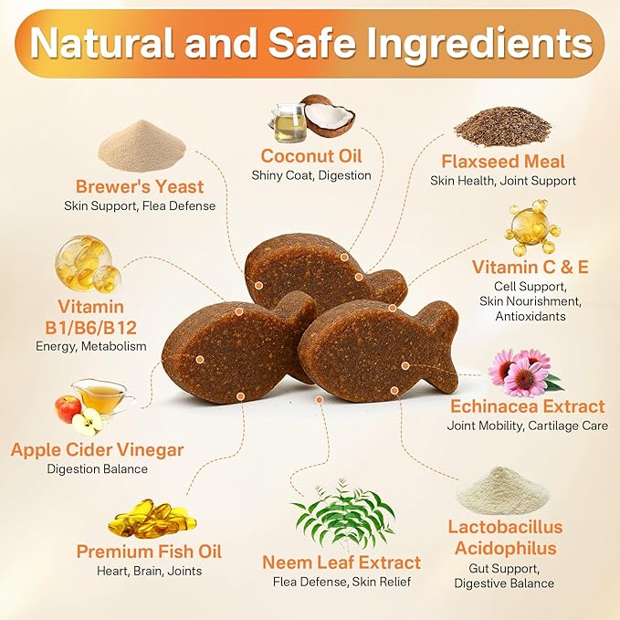 - Active Ingredients : Flaxseed Meal, Brewer's Yeast, Coconut Oil, Fish Oil, Neem, Echinacea Extract, Vitamin C, Apple Cider Vinegar, Vitamin B12, Vitamin B1, Vitamin B6, Vitamin E, Lactobacillus Acidophilus Flaxseed Meal, Brewer's Yeast, Coconut Oil, Fish Oil, Neem, Echinacea Extract, Vitamin C, Apple Cider Vinegar, Vitamin B12, Vitamin B1, Vitamin B6, Vitamin E, Lactobacillus Aci… See more