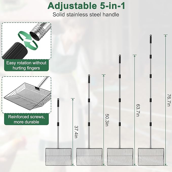 15-inch Large Chicken Poop Scooper, 5 in 1 Adjustable Chicken Coop Scoop with Ergonomic Grip, 24" to 77" Long Stainless Steel Sifting Litter Shovel Pooper Scooper Chicken Coop Accessories