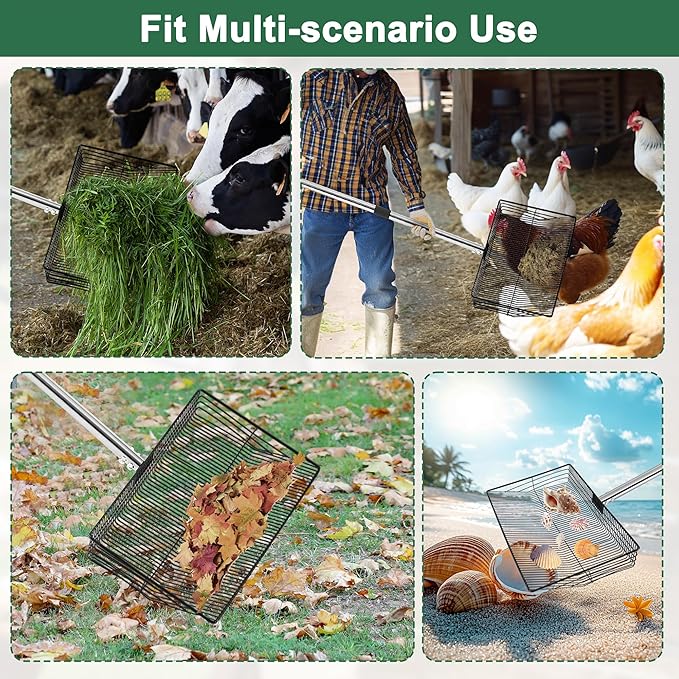 - π [Widly Use Extra-wide Sifter Shovel] This chicken coop sifting shovel can be used for large-scale cleaning work, It can also be used as aleaf cleaning shovel, beach sand shovel, horse/cow/sheep poop scooper, etc. Whether you are using it for a small backyard or a large farm, this sand sifter shovel will do the job.