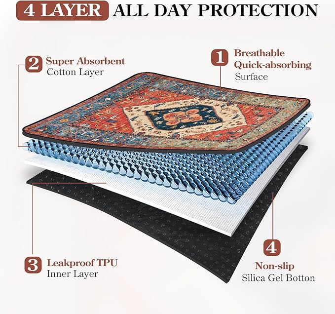 - Ultra Absorbent and Leakproof: Featured a soft, fast-absorbing top layer and a high-density core that locks in moisture on contact. The waterproof TPU backing provides superior leak protection, keeping your floors and furniture clean and dry