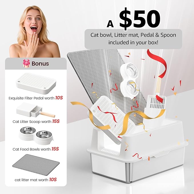 - 【UPGRADED DESIGN, DOUBLE CAPTURE】Our metal litter box now features a refined pedal with a built-in litter mat for enhanced litter trapping, plus an added cat bowl for convenience. The redesigned footboard ensures easy access for all cats, from kittens to seniors, making it perfect for their natural habits. It’s a smarter, cleaner solution for your feline friend!