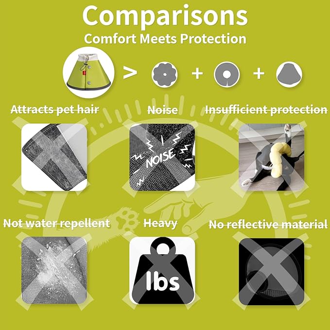 - 【Soft & Lightweight】 Crafted with internal EVA material and Rib Fabric, our cone collar weighs just 3 ounces—half the weight of an egg. This lightweight design ensures dogs sleep comfortably without feeling burdened or restricted around their necks. Plus, the soft cone collar provides excellent rebound near walls or furniture, ensuring your pet's safety without emitting loud noises