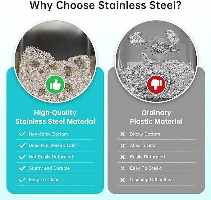 - 【Why Choose Stainless Steel Litter Box!】 Open top stainless steel cat litter box made of high-quality ABS enclosed high wall enclosure and stainless steel litter pan, unlike plastic litter boxes, stainless steel litter boxes with high sides do not collect any residue or odor, are easily to clean, have strong and durable, and never rusty